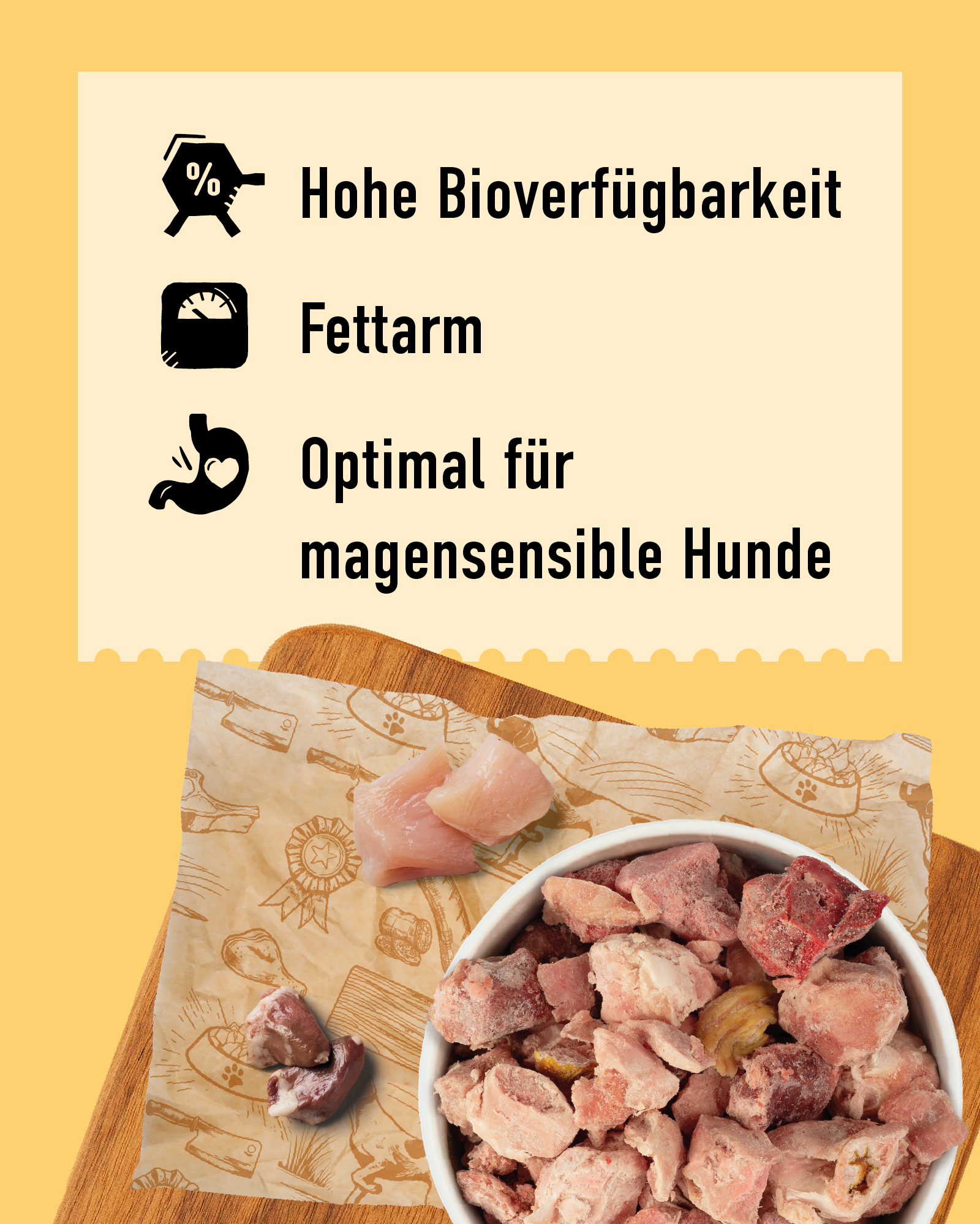 DIBO Geflügel Frostfutter ist gut für sensible Tiere oder auch als Reduktionskost geeignet.