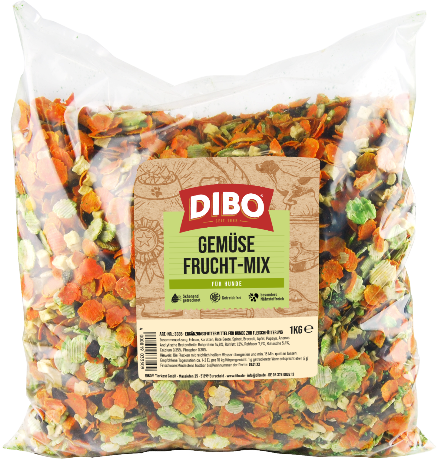 Die hochwertige und getreidefreie Mischung aus nahrhaftem Gemüse und vitaminreichen Früchten: unser Gemüse-Frucht-Mix – ist eine optimale Multivitamin-Futterergänzung. Ein reines, schonend getrocknetes Naturprodukt, welches jede B.A.R.F. Mahlzeit ihres Vierbeiners geschmacklich und gesundheitlich bereichert!