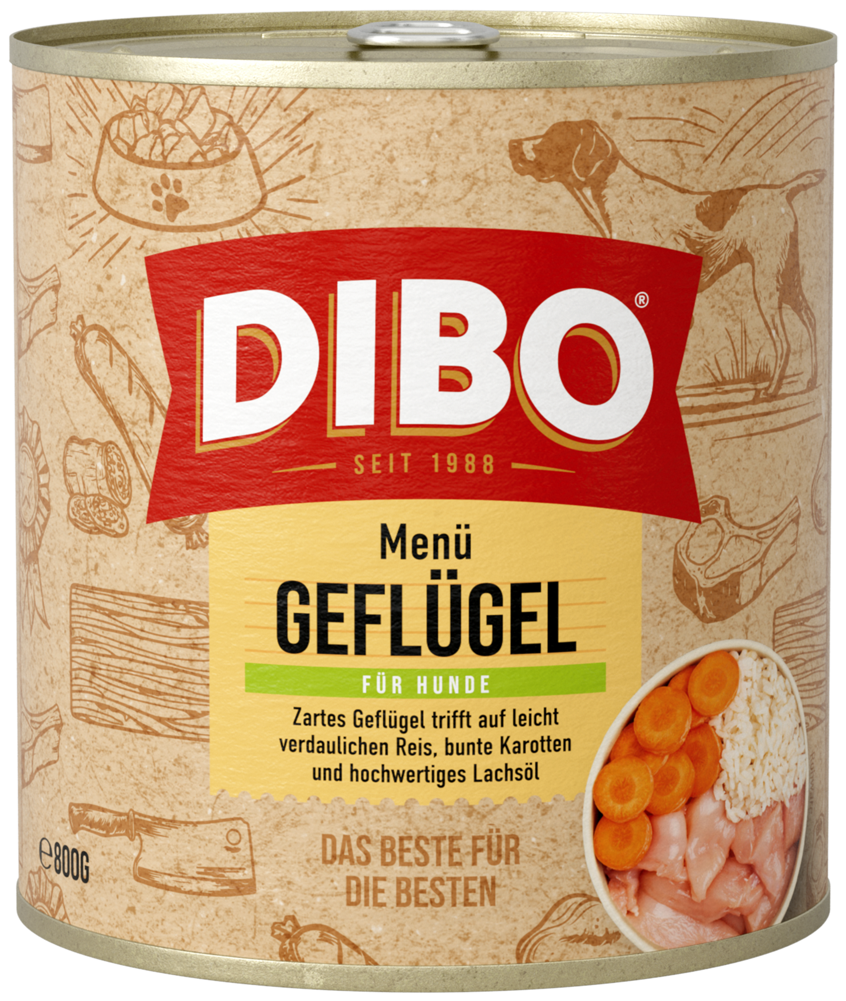 DIBO Geflügel MENÜ vereint mageres Geflügelfleisch und Innereien mit der Kohlenhydratquelle Reis und schöpft weitere Vitamine aus Karotten und Lachsöl.
