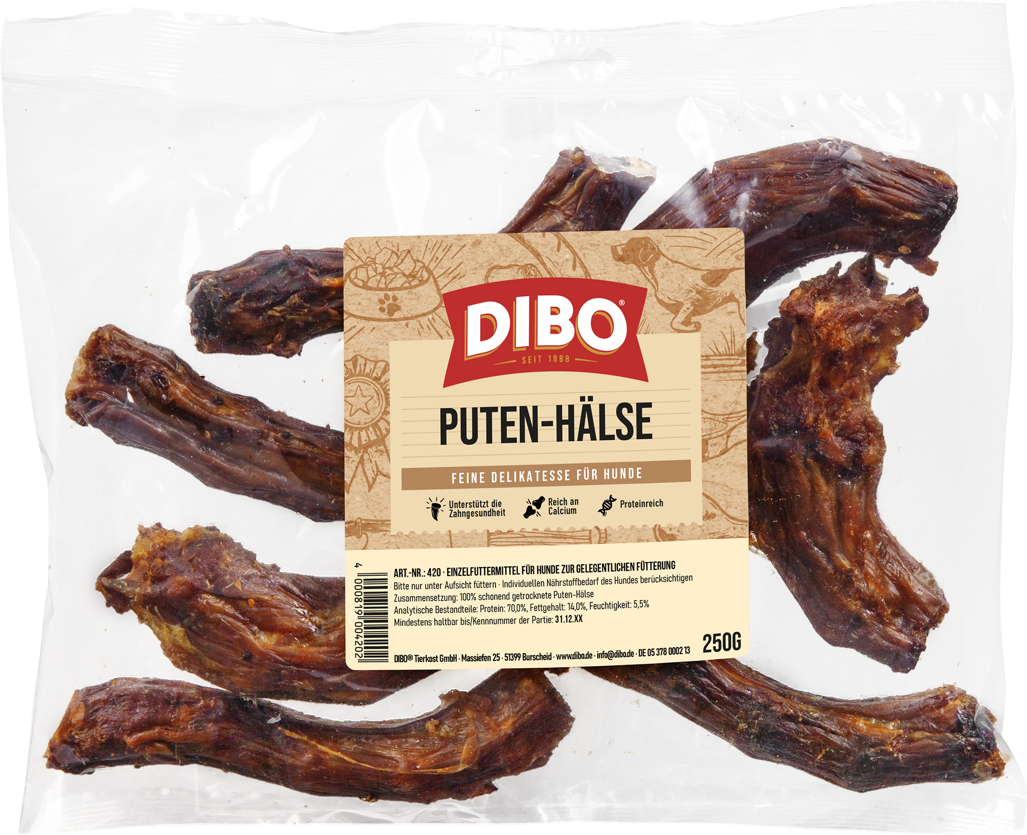 Der hohe Fleisch- und somit Proteinanteil in den schonend getrockneten Puten-Hälsen von DIBO macht diesen knusprigen Kausnack zu einer hervorragenden Zwischenmahlzeit.