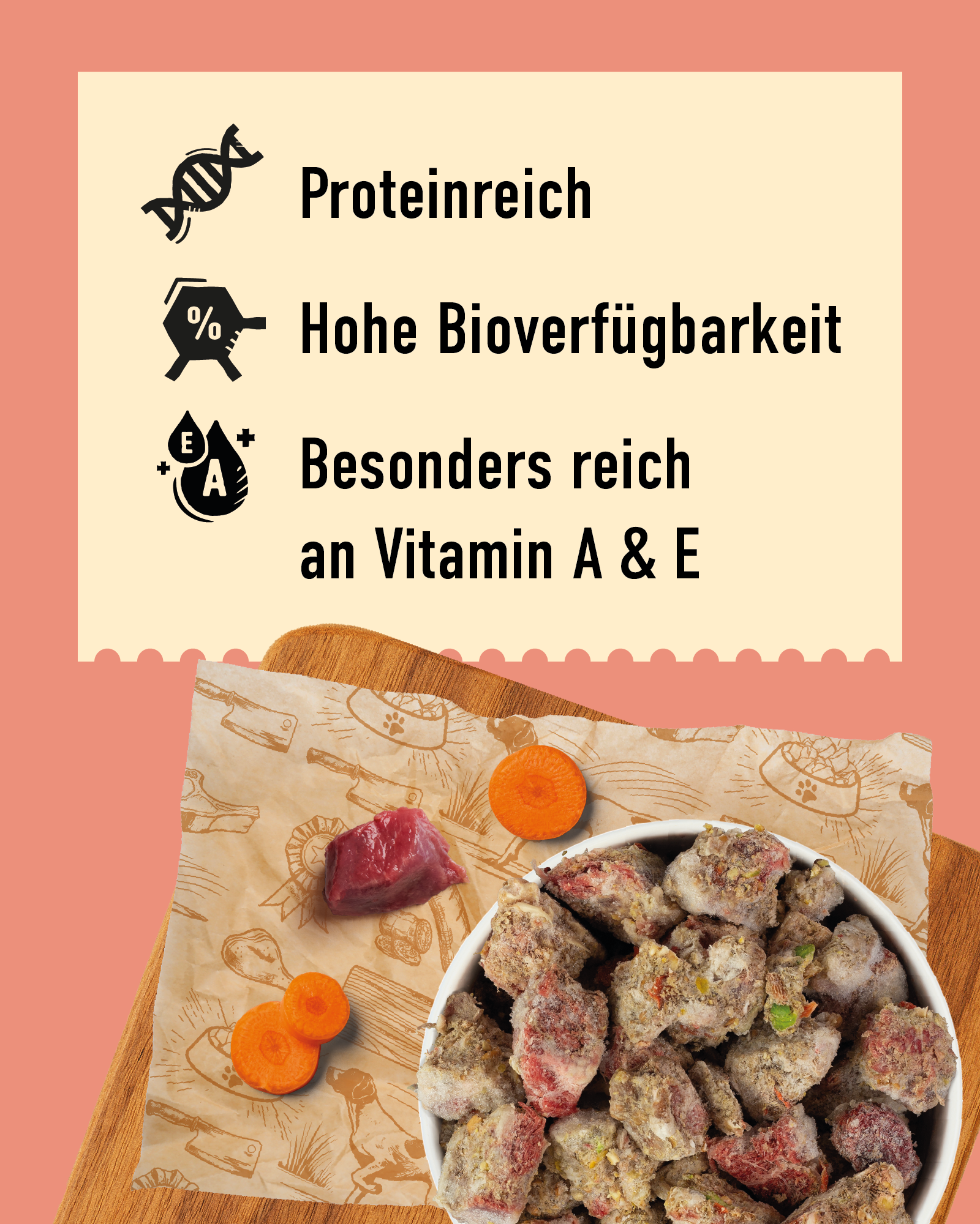 Das DIBO Fleisch-Menü besteht zu etwa 2/3 aus zartem Muskelfleisch und magerem Rinderherz, zu etwa 1/3 aus hoch aufgeschlossenem Getreide und Gemüse, Vitaminen und Mineralstoffen. Tauen Sie diese Vollnahrung einfach auf und fertig!