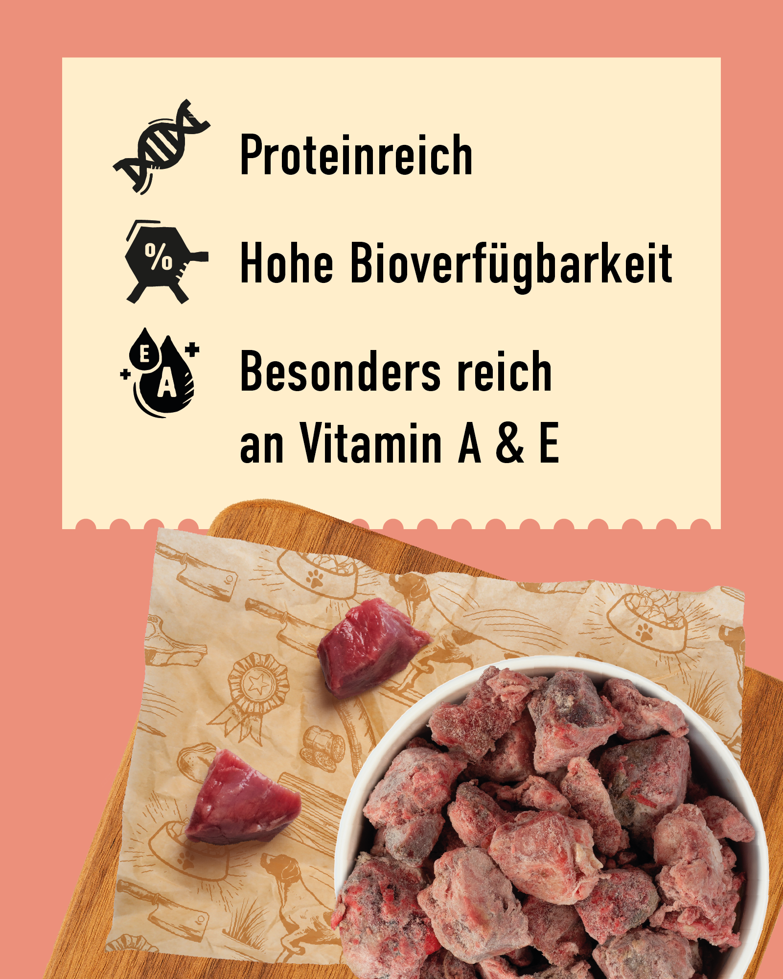 Dieses Produkt besteht aus wertvollem Fleisch und Innereien vom Rind, die allesamt auch für den Menschen genusstauglich sind. Ein glänzendes Fell und geringe, feste Kotmengen sind das Ergebnis.