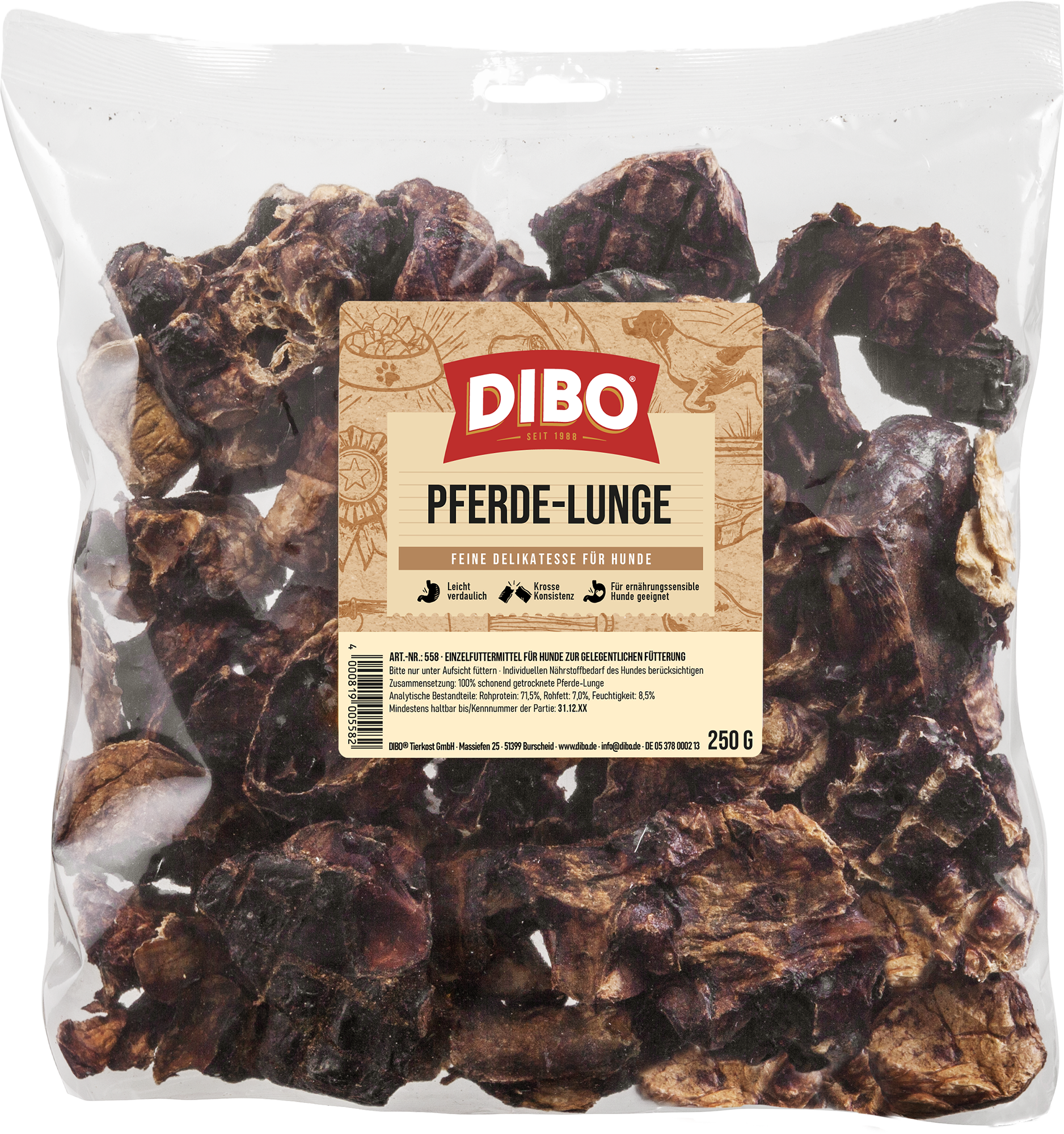 In der biologisch artgerechten Rohfleisch-Ernährung (B.A.R.F.) stehen Innereien mit auf einem ausgewogenen Speiseplan. Die DIBO Pferde-Lunge in verzehrfähigen Stücken ist besonders mager und eiweißreich. Aminosäuren sind die kleinsten Bestandteile von Eiweißen und verantwortlich für den Aufbau und Erhalt von Organen, Muskeln und die Funktionstüchtigkeit von Enzymen. Sie sind ideal für Hunde mit empfindlichem Magen-Darm-Trakt. Aus diesem Grund steht Pferde-Fleisch ganz oben auf dem Ernährungsplan sensibler und zu Allergien neigender Vierbeiner. Hier empfiehlt sich unsere getrocknete Pferde-Lunge ganz besonders.
