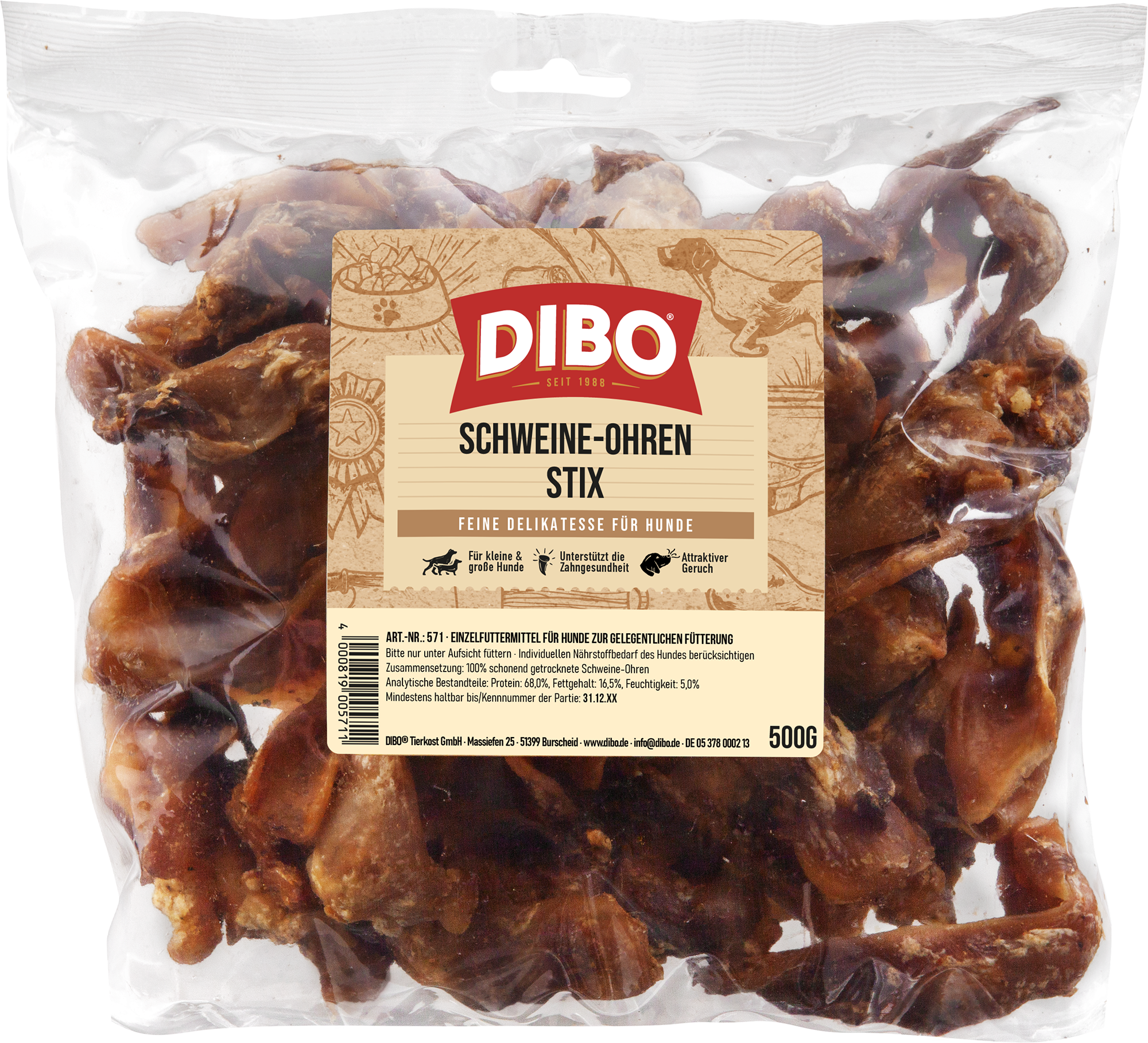 Der schmackhafte Hundehappen bricht regelmäßig alle Rekorde und begeistert Hunde jeder Größe und Rasse. Die zähe Delikatesse verlangt einiges an Kauleistung, weshalb bei den geschnittenen und gut portionierten Schweine-Ohren-Stix von DIBO endlich auch kleinere Vierbeiner auf ihre Kosten kommen. Unsere Schweine-Ohren-Stix enthalten einen hohen Anteil an ungesättigten Fettsäuren und nur wenig Cholesterin, was sie zu einem besonders bekömmlichen Snack macht. Durch die schonende Trocknung bleiben Vitamine, Mineralstoffe und Spurenelemente erhalten, sodass die Schweine-Ohren-Stix von DIBO eine gesunde Gelenkfunktion unterstützen, damit Ihre Fellnase unbeschwert durchs Leben hüpfen kann.